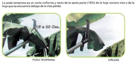 Tanto la poda temprana como la cirugía, son labores semanales debido a que las plantas están brotando en períodos que   lo 10  hasta los 7 dias acorde con el clima y la sigatoka destruye una hoja en 7 dias.