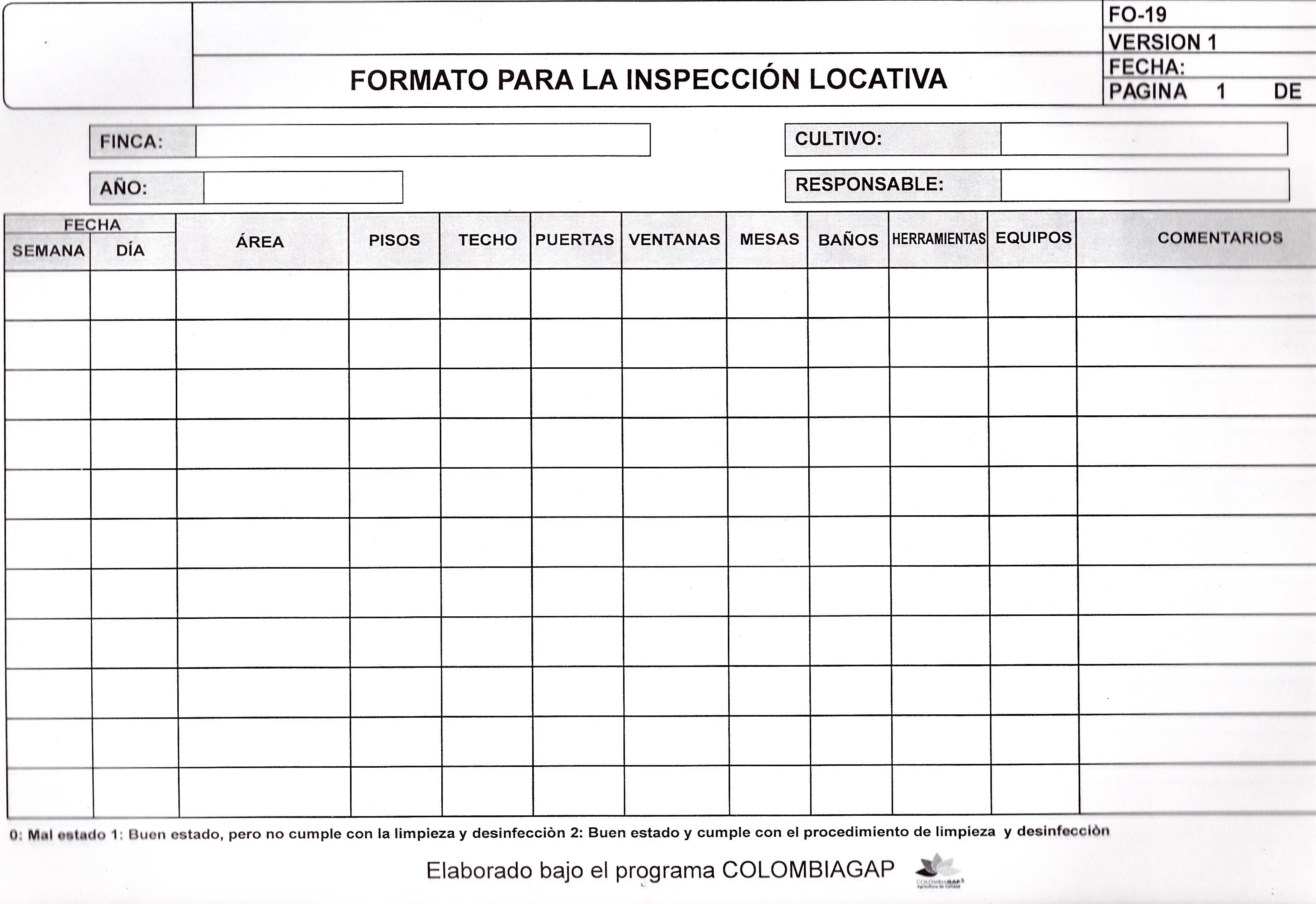 Recordemos que estamos produciendo alimentos y que la primera p0remisa de la certificación es la de obtener productos inocuos, es decir que no ofrezcan peligro alguno y la limpieza es uno de los principales objetivos de la inocuidad. Las ramas de salud del gobierno tienen normas en la producción de alimentos que cobijan las instalaciones y los equipos con los cuales se produce o manipula un producto. Cada vez que vamos a efectuar una labor de poscosecha debemos diligenciar el formato F-19 y periódicamente, debemos diligenciarlo para las demás instalaciones como bodegas.