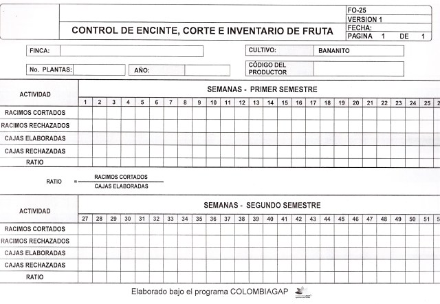 Hoy publicaremos los últimos dos formatos relacionados directamente con el cultivo y ambos tienen que ver con la postcosecha. Con el Formato F-25 el cual se puede llevar por cada lote sembrado, nos proporciona una evaluación continua de la eficiencia de los métodos administrativos, de cultivo, abonamiento y todas las prácticas adoptados  durante el proceso de certificación. en cada corte, la elaboración de éste formato nos dice, acorde con el número de plantas sembradas, cuántos racimos cortamos y cuántas cajas o kilos pudimos vender con la calidad que nuestro comprador exige. El dato que arroja la división de el número de racimos cosechados entre el número de cajas o kilos despachados, es nuestro índice de eficiencia. y al final del año, el número de racimo cortados, dividido por el número de plantas sembradas nos da el indice de retorno.  Los cálculos de rentabilidad de un cultivo se sacan con un índice de retorno igual a 1 (uno); es decir, que cada sitio sembrado, nos produce al menos un racimo anual y su disminución o aumento con respecto a la unidad, dice que tan bien manejamos el cultivo, bajo las normas de peso y calidad esperadas.