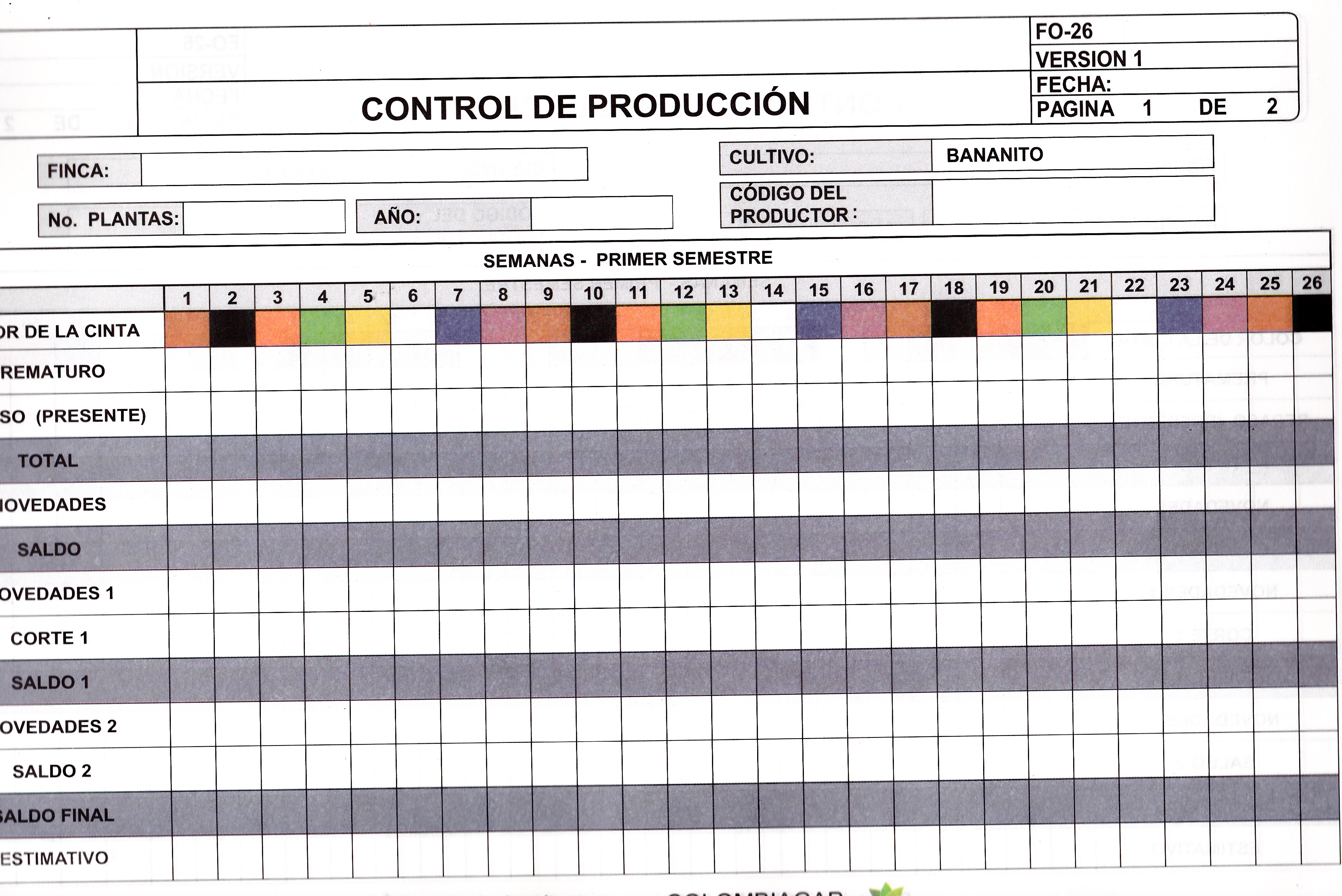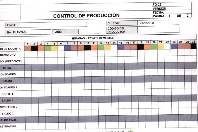 El Formato F-26 CONTROL DE PRODUCCIÓN, el cual se debe llevar por cada lote, nos muestra el número de racimos encintados y el número de racimos cosechados y nos avisa con anticipación al corte, cuentos racimos debemos esperar para esa semana, con el fin de avisar a los compradores de nuestra disponibilidad de fruta ese día.  El código de colores, que en este formato es de 8, es el utilizado en el cultivo del baby banana o bananito, porque el tiempo entre belloteo y cosecha es de 8 semanas.  En plátano y banano   de colores aumenta hasta 16 semans, con lo cual es necesario hacer combinaciones de dos colores,  con el fin de completar el número de semanas entre belloteo y cosecha, publicamos el primeer semestre y es sencillo para el lector, completar el segundo.  El dato «Prematuro» se refiere al embolse que se hace de la bellota, antes de que aparezcan los primeros dedos; es decir cuando la bellota mira hacia abajo, sin abrir, Lunes por ejemplo. Si en el cultivo se tiene por costumbre embolsar otro día adicional al Lunes; por ejem. el Viernes, lo llamamos «Presente» o Repaso. las novedades, se refieren a racimos de plantas caídas o  dañadas.   La primera utilidad que obtenemos del F-26 es que, al menos en nuestro país, Colombia,  una vez se corta la fruta y no está vendida, disminuye su valor, como es el caso de todos los productos perecederos. El comprador sabe que si no vendemos nuestro producto rápidamente, comenzará a deteriorarse y a perder calidad y por ende precio; pero si nosotros sabemos con anticipación, que día y cuanta cantidad se tendrá disponible, es posible negociar con anticipación, buscando el mejor precio para nuestra fruta y en caso de los almacenes de cadena o compradores organizados, el aviso oportunos nos permite conocer si nuestro comprador tiene capacidad para comprara la totalidad del corte o tendremos que conseguir compradores adicionales.