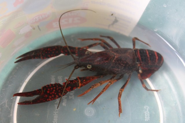 En Colombia no tenemos esa clase de crustáceos y me referí obviamente al Internet y encontré que se trata de un ejemplar de «PROCAMBARUS CLARKII«, originario del norte del Golfo de México y usado algunas veces en acuarios. para mi sorpresa, pertenece a la familia de los cangrejos y se le conoce como cangrejo rojo o Cangrejo Americano en España