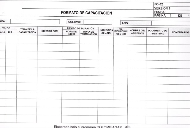 En el desarrollo de las «Competencias Laborales» para con los operarios de la plantación y de planta, son necesarias capacitaciones y recapacitaciones sobre los distintos temas que competen por una calidad deseadas del producto. Como mencionamos desde un principio, es necesario dejar constancia escrita de todo proceso de copacitación y el diligenciamiento del Formato que se adjunta, llena los requisitos exigidos por la norma.