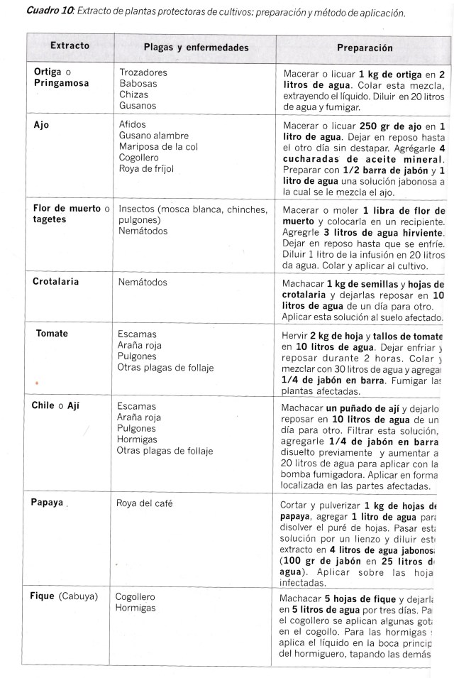 La » Guia Para la Caficultura Ecológica» patrocinada por la GTZ trae en uno de sus apartes las formulas de preparación de los llamados «Purines» de plantas con propiedades insecticidas, nematicidas y fungicidas con el fin de proteger los cultivos de ataques no deseados de hongos, insectos, nemátodos y plagas en general. Los insecticidas naturales actúan por contacto o por ingestión y son fáciles de preparar a base de recursos naturales de la región y pueden manejarse sin mayor peligro para la salud de los humanos. A continación presentamos la tabla de preparación y actuación de los mismos.