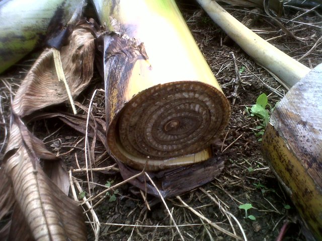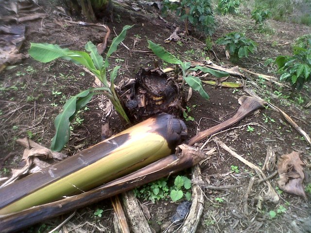 Me gustaría compartir un par de fotos tomadas el día de hoy, sobre el «mal de Panamá» el cual se dice es causado principalmente por la acción del hongo Fussarium oxysporum y por el ataque subsiguiente de otros hongos y virus. Su identificaión es relativamente sencilla por el necrosamiento de la base del seudotallo y por la marca en el medio que se ve luego del corte trasversal a la altura de la formación del incordio floral. No deja de ser interesante observar como los rebrotes dem la planta están sanos y mediante tratamiento, podrían sobrevivir. no es conveniente dejarlos, porque podrían ser fuente de infección para plantas vecinas, sinembargo es posible sembrar a los 50 cms. el reemplazo, siempre y cuando se le haga el tratamiento adecuado no solo al cormo sino al terreno