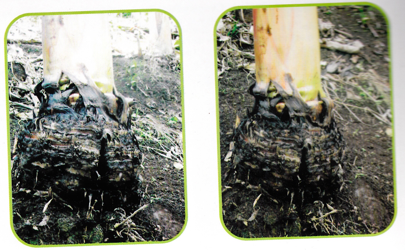 Esta enfermedad se caracteriza por un crecimiento exagerado del cormo, cuyo agente es aún desconocido, con posterior arrugamiento y pudrición de la base de las calcetas que termina con el volcamiento total de la planta. Si se produjo racimo, este carece de valor comercial y los nuevos colinos se afectan también de pudrición, con lo cual el sitio como unidad productiva, desaparece.